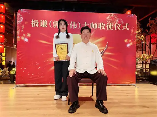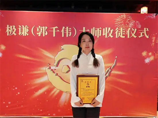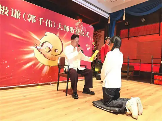 8、请师父极谦给弟子邓红玲宣读回徒贴,并颁发入室弟子证书。请师父极谦给弟子邓红玲入门信物。