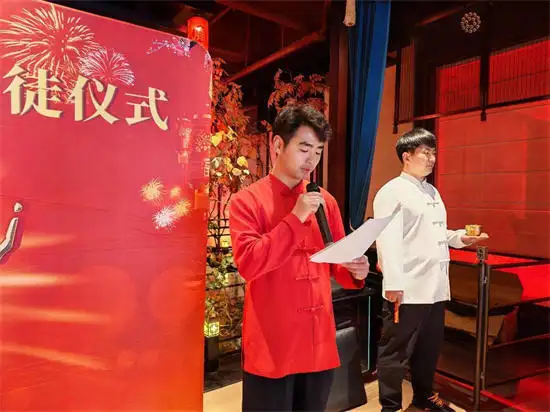 (1)请拜师人邓红玲整理衣帽,请向后转身,首先向参加活动的嘉宾行拱手礼 ,行礼......