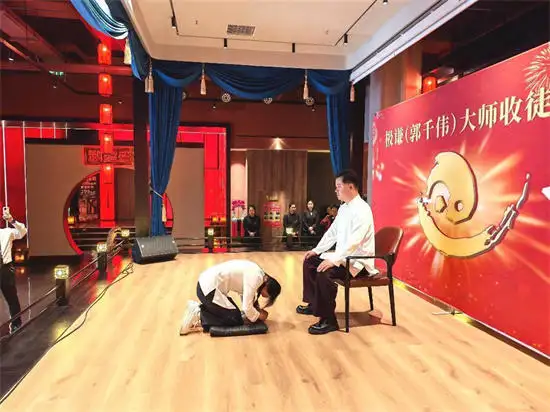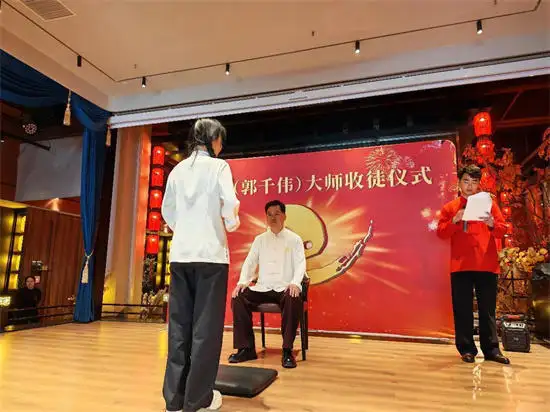 (2)邓红玲向嘉宾行拱手礼后,请向后转身,再向极谦老师行鞠躬礼,行礼......,行鞠躬礼后两手垂立,请恭敬地站在极谦老师面前。(介绍拜师人)拜师人邓红玲,1976年出生,来自河南洛阳。